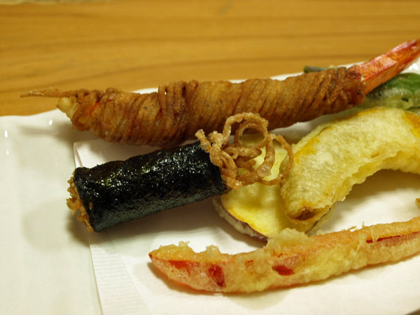 蕎麦屋ならではの天ぷら、限定二十食。海老を蕎麦で巻いたモノ、蕎麦の磯辺揚げなど。