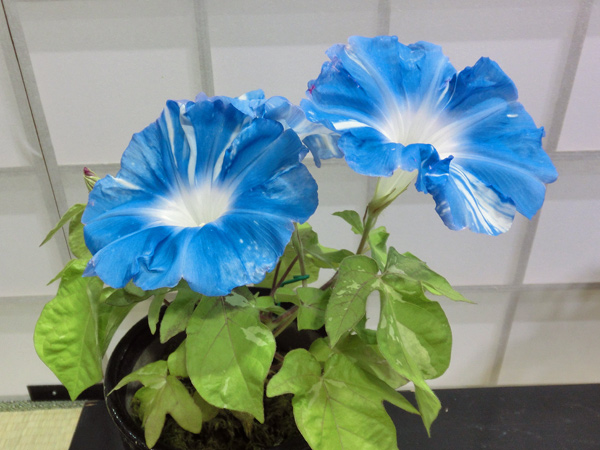 名城公園フラワープラザ展示会の作品、正式には『名古屋式盆養切り込みづくり大輪朝顔』と云います。