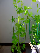 2005/3/8(火) 高さは170cm近くある。 上から下まで全部に日があたる場所がないので、せめて出来るだけ長く日があたる様にと東側の壁に鉢を置いてあるけど、日があたってない所は葉っぱが茶色。ご近所に分けてあげた地植えの豆は、丈は50cm位しか伸びてないけど茎は太いし葉がまたおっきい。 奥さんに「そりゃやっぱり、プランターと地植えは違うよ」と言われてしまった。 |