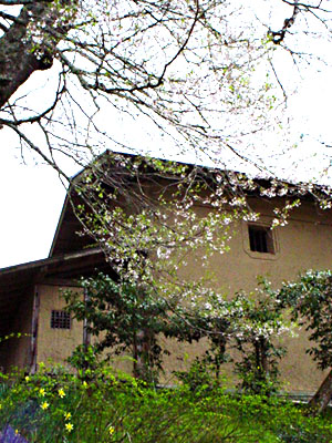 数年前に亡くなられたご主人の後を継いで、高齢の奥様が丹精込めて咲かせている、「新田の桜」。樹齢500年近くになるヒガンザクラです。 以前行った時は4月の中旬に満開でしたが、今年はやはり咲くのが早かった様で、すでに葉桜でした。ちょうど桜の傍に居合わせたご近所の方のお話では、蕾が育った頃に降った思わぬ雪のせいで、今年は花が良くなかったそうです。 でも、この桜を見るたび感動を覚えるのが幹。ここの桜は下から見上げられるので、幹が良く見えます。この逞しく美しい幹が何百年もの間、たくさんの枝を支えてきたのです。 庭には他にも20本以上の桜がありますが、この桜の種から育てたものです。何百年後にはこの親桜の様に大きく育っているかもしれません。 余談ですが、桜のすぐ側の道を数キロ登って行くと、有名な大船神社の弁慶杉があります。現在、その道を風力発電の装置を運搬する大きな車が登り降りしているそうなので、お気をつけ下さい。 「新田の桜」の満開時の画像を見たい方はこちらをどうぞ。