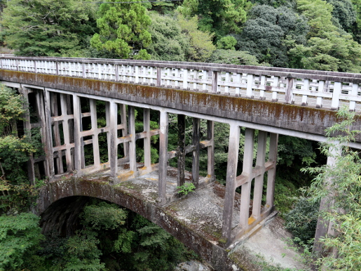 オープン空間にある井桁状に組まれた支柱は耐震性や安全性を高め、日本古来の木組みを思わせる優れたデザイン的特徴となっており、全国的に例を見ません。 現在は3代目の黄柳橋が架けられ、2代目の黄柳橋は歩道として利用されています。この旧黄柳橋は、愛知県内で土木構造物として初めて登録文化財として国に登録された建造物です。 |