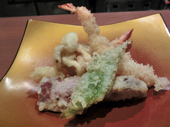 天ぷらは、しめじ、モロッコいんげん、蓮根、薩摩芋、南瓜の野菜5種に海老2匹。どれもカラッと揚っていて美味しかったです。そば湯は別造りで小鍋を使って蕎麦粉を水で溶き 蕎麦の茹で汁で伸ばした弱ポタージュ系でした。 |