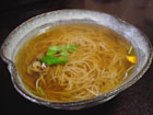 麺は画像でも判る様に極細でエッジもキレイに裁っている。これだけ細いと腰の強さはあまりないが、ノド越しは十割りとは思えない程のスッキリ感を味わえる。漬け汁は麺との相性も良くお互いの良さを引き出している。そば湯は別作りのポタージュ系。 |