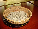 奈良の造り酒屋「春鹿」の蔵元の敷地内にある木造平屋の離れにお店はある。土・日・月の変則的な休みの為、ここだけに行くつもりでないとなかなか訪ねる事が出来ない。 前回98年の夏に伺った時は、初めて訪れた私も緊張していたのだろうか、真夏の陽射しがすだれ越しに差し込む中、店内にも緊張感が感じられたが、今日は初夏を思わせる陽気の中、凛とした空気と程よい静寂がここち良く感じられた。 せいろ、田舎の二種類を食したが、さすがに関西の手打ち蕎麦のトップを走り続けているだけの事はある。 今回、特に感じた事は、漬け汁の洗練された味。鰹の風味や旨味を存分に引き出しながら、尚且つ何とも言えぬ芳醇さが口の中にひろがる。島崎さんのこの7年間の変革と進化を感じさせる絶品の漬け汁である。 アタの器に蕎麦を盛るという発想・センスに驚かされつつ、あのユーミンこと松任谷由美をして、文芸春秋での対談の席において人生最後の晩餐には「玄」の蕎麦をと言わしめた事を再確認させられた。 私の中では「藪蕎麦・宮本」「ふじおか」「仲佐」に並ぶ最高峰の蕎麦。 田舎そば 1050円 せいろそば 1050円 蕎麦団子 420円