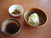 東京の旅行会社に勤めていた草野さんが、雑誌に出ていた蕎麦職人の記事に触発され一念発起、35歳から4年半、戸隠の「うずら屋」で修業後、2001年4月に開店。 建物は一見すると、都会の洒落たカフェかと思わせる。暖簾をくぐって一歩店内に足を踏み入れると、大きく取った窓から見える風景は、心に安らぎを運んでくる。天気の良い日には北アルプスの姿が一望出来て最高だろう。建物内部にはシナベニアを旨く取り入れ、BOSEのスピーカーから流れるジャズの音色も耳に心地よい。地元の作家に焼いて貰った器なども含め、店主のセンスの良さが余すところなく表現されている。 長野県安曇野地区の玄そばをメインに自家製粉し、二八の麺に打ち上げている。私がいただいたのは「草の子セット・そば(ざる叉はかけ)、小玉そばがき、季節の小鉢、天ぷら盛り合わせ、そば菓子(そばゼリー)」の5品と別注文の蕎麦屋のダシ巻き卵で、相方はかけそば。麺は少し柔らかめで、漬け汁は、せいろ・かけ共に濃い目で万人向け。私的にはもう少し辛くても良かったかな。しかし、そばがきは小玉とはいえ量もあるし、大葉の天ぷらは葉を2枚重ね合わせ、軸を海苔で捲いて離れない様に工夫するなど細かい所にも気が使われていた。そばゼリーも黒蜜ときな粉がいい味を引き出すなど、ここが新潟との県境にある田舎の蕎麦屋とは思えない程。旅先なのでちょっと点数が甘いかなとも思うけど、こんな蕎麦屋を見つけると、つい嬉しくなる。
