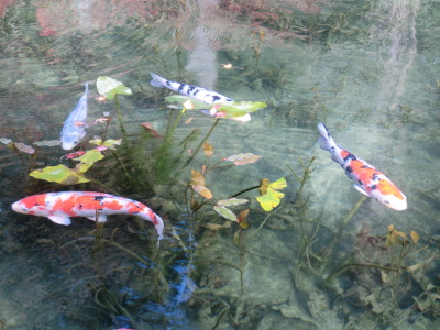 12月1日(土) 『モネの池』 写真は関市のモネの池。 鯉がこんな透明な水の中にいる姿ってあまり見た事がありませんが、この池は100%湧水なので地面まで見えます。 その中で泳ぐ姿はまるで浮いている様。 それはそれは神秘的。 2年前、新聞の記事で見て、いつか行こうと温めていましたが、行って良かった。 新聞の写真だと、どこか山奥にあるみたいでしたが道路からすぐ入った場所にありました。 睡蓮が咲いているともっと綺麗でしょうが、あじさいまつりの時は大渋滞になるそうなので良かったかな?